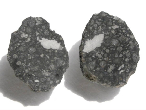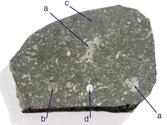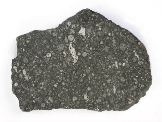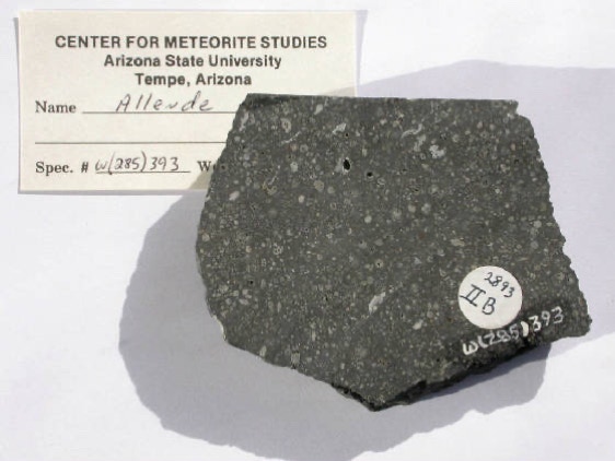 Allende is a rare type of meteorite, a carbonaceous chondrite, so called because it is rich in carbon. Allende contains CAIs, calcium-aluminum inclusions, predominantly white to light gray in color, irregularly shaped, and rich in refractory (high-temperature) minerals and they are thought to have formed at the very beginning of the solar system about 4567 million years ago.In addition, Allende hasmany well defined, more or less spheroidal chondrules. Both, the chondrules and the CAIs formed during rapid heating events at the dawn of the solar system. Numerous analyses indicate that CAIs formed about two million years earlier than chondrules. Relict pieces of CAIs have even been found inside chondrules, and so must have formed earlier. However, rather strange is the fact, that two Japanese scientists of the Tokyo Institute of Technology found a chondrule inside a CAI, which strongly indicates that some chondrules must have formed before CAIs...