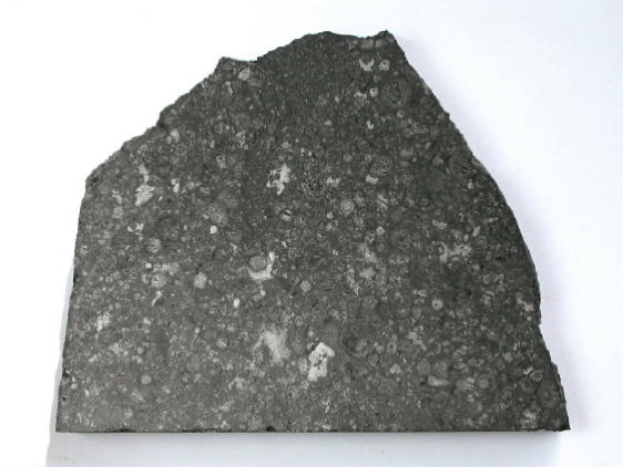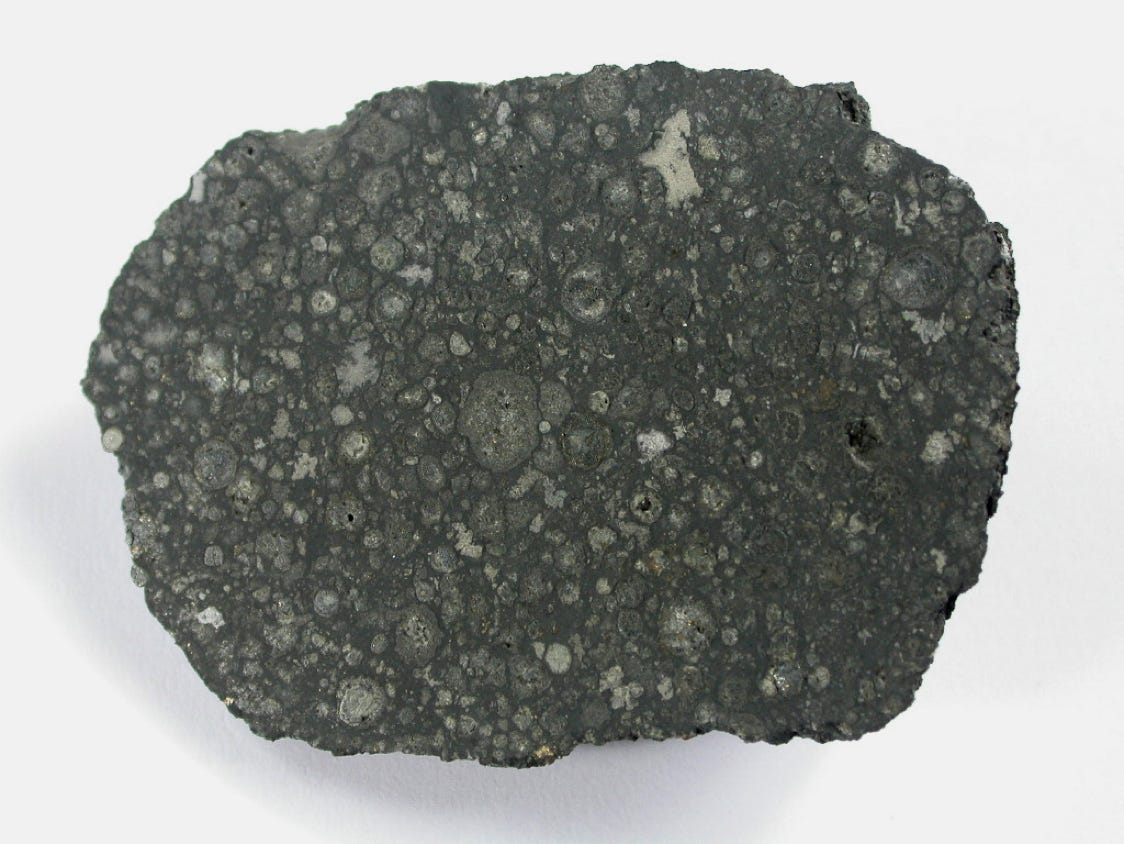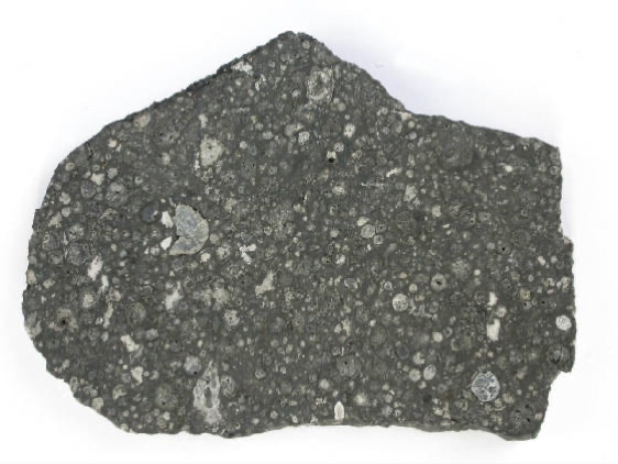 Allende is a rare type of meteorite, a carbonaceous chondrite, so called because it is rich in carbon. Allende contains CAIs, calcium-aluminum inclusions, predominantly white to light gray in color, irregularly shaped, and rich in refractory (high-temperature) minerals and they are thought to have formed at the very beginning of the solar system about 4567 million years ago.In addition, Allende hasmany well defined, more or less spheroidal chondrules. Both, the chondrules and the CAIs formed during rapid heating events at the dawn of the solar system. Numerous analyses indicate that CAIs formed about two million years earlier than chondrules. Relict pieces of CAIs have even been found inside chondrules, and so must have formed earlier. However, rather strange is the fact, that two Japanese scientists of the Tokyo Institute of Technology found a chondrule inside a CAI, which strongly indicates that some chondrules must have formed before CAIs...